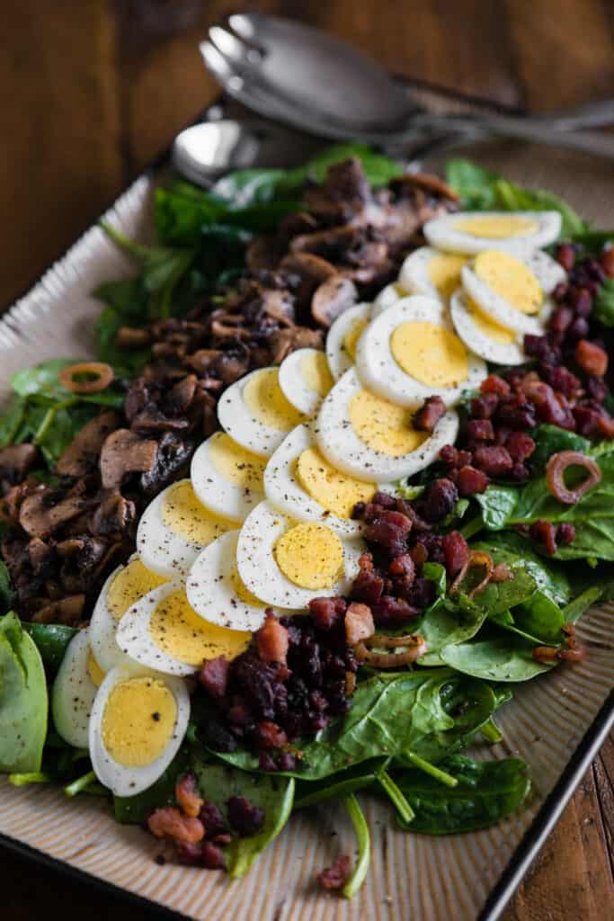 Baby Spinach Salad with Greens, bacon, egg, red onion, mushrooms, Bacon Viniagrette