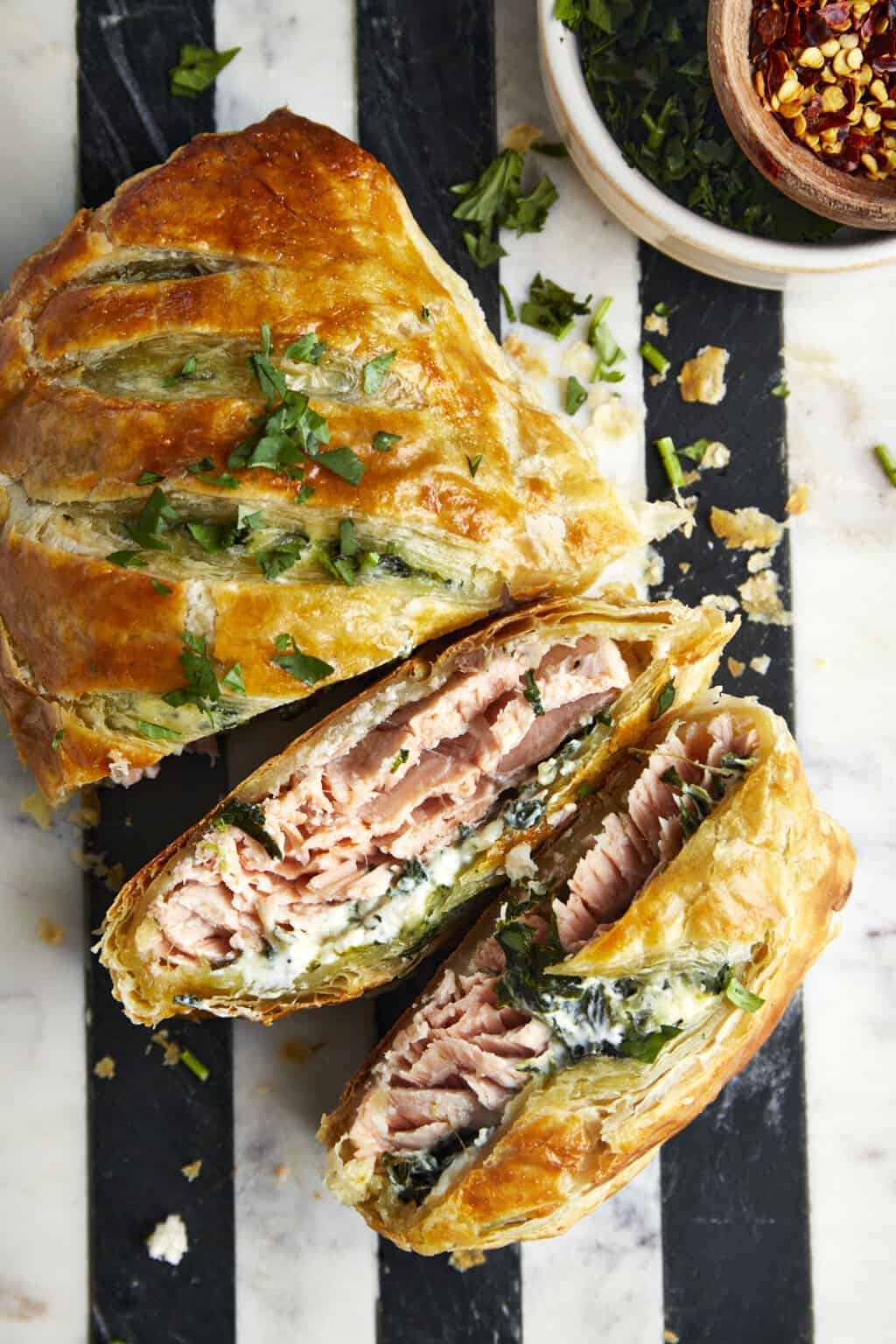 Baked Salmon Wellington, Pastry, Spinach, Lemon, Dill